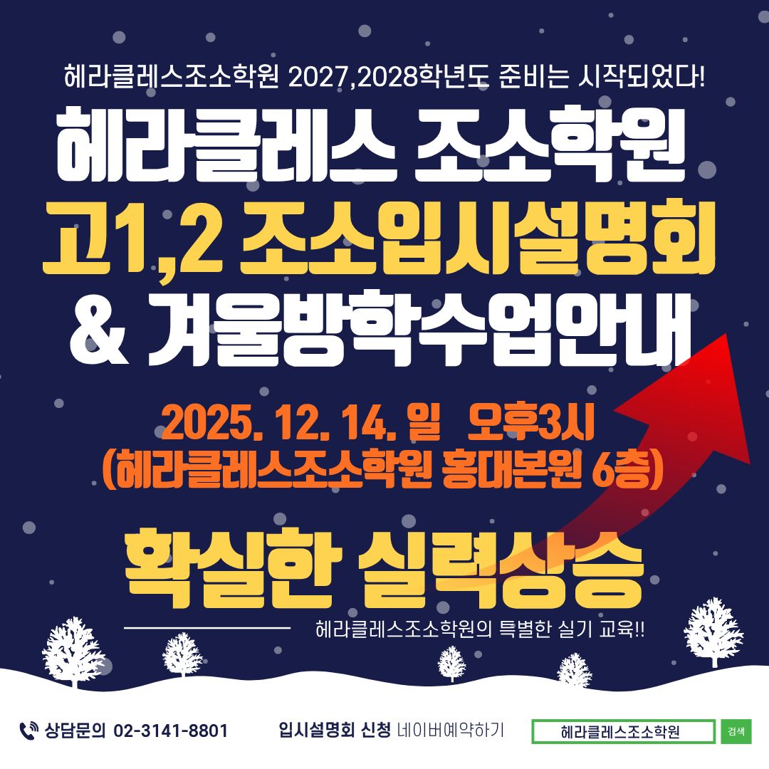 <![CDATA[2026,27학년도 입시설명회(5/17 토 5:30pm)]]> <헤라클레스조소학원 홍대본원 조소입시설명회 안내> 안녕하세요. 헤라클레스조소학원 홍대본원입니다. 새 학기가 시작되고, 첫 번째 관문인 중간고사가 마무리되는 시기입니다. 첫 모의고사와 중간고사가 마무리된 지금! 수시? 정시? 이제는 본격적으로 대입 전략을 세우고 입시 준비에 박차를 가해야 할 시점인데요. 조소 입시를 준비하고 계신 분들이라면, "내 실력에 맞는 대학은 어디일까?" "조소 입시는 어떻게 준비해야 할까?" 하는 고민이 많으실 거라 생각합니다. 그래서! 대한민국 조소 입시의 중심, 헤라클레스조소학원에서 2026,27학년도 조소 입시설명회를 개최합니다. ★★이런 분들께 추천드립니다!!★★ ▶현재 조소 입시 중인 자녀를 둔 학부모님 ▶조소에 관심은 있지만 아직 시작을 망설이고 있는 예비 수험생 ▶조소 입시에 대한 정보가 부족하신 분 ▶정확한 입시 전략이 필요한 분 입시설명회는 누구에게나 열려있습니다. ★★조소 입시설명회에서는 어떤 내용을 다루나요?★★ 본 설명회에서는 ▶조소 입시의 전반적인 흐름 ▶실기 대비 전략 ▶성적과 실기에 맞는 대학 분석 ▶최신 입시 데이터 기반 전략 수립법 까지! 조소 입시에 필요한 모든 정보를 알려드립니다. 역대 서울 수도권 주요대학 2550명 합격생을 배출한 배승조 총원장님께서 직접 설명회를 진행하시며, 실제 사례와 데이터 중심으로 실질적인 도움을 드리는 설명회가 될 것입니다. ★★왜 헤라클레스조소학원일까요?★★ ▶국내 조소과 대학 최다 합격 실적 보유 ▶체계적인 커리큘럼과 맞춤형 피드백 ▶입시 트렌드를 반영한 실기 지도 ▶정시/수시 각각에 맞춘 전문 컨설팅 제공 헤라클레스는 입시 결과로 증명하는 학원입니다. <설명회 일정 및 신청 방법> 장소: 헤라클레스조소학원 홍대본원 일정: 2025. 5. 17. 토요일 오후 5시30분 (약 3시간 진행) 네이버예약  사전 예약 필수 / 선착순 마감 네이버예약바로가기 ※ 좌석이 한정되어 있으므로, 빠른 신청을 권장드립니다. 조소 입시, 이제는 정확히 알아야 합니다! 조소 입시는 감각뿐만 아니라 정확한 전략과 정보가 반드시 필요한 입시입니다. 부족한 정보로 고민하지 마시고, 가장 많은 합격 사례를 만들어낸 전문가에게 직접 듣는 입시설명회에 참여해 보세요. 입시 성공의 방향을 잡아드리겠습니다. 지금 바로 신청하세요! ]]> Sun, 20 Apr 2025 16:46:08 +0000 community-공지사항 <![CDATA[★★2025학년도 합격생명단★★]]> <2002년 개원 후 서울권 주요대학 대거 합격자 배출!!!> 헤라클레스 조소학원은 변함없이 최선으로 교육하고 있습니다.